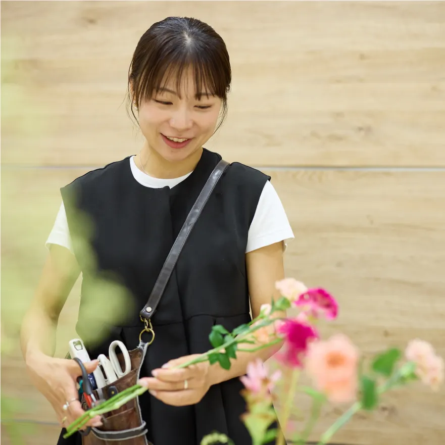 小学4年生から高校3年生まで、ずっと器械体操に打ち込む日々。インターハイや国体にも出場し、学生時代のすべてを体操に捧げてきました。その反動からか、次第にメイクやファッションの世界に惹かれ、キラキラとした舞台に憧れてブライダルの専門学校へ進学。なかでもフラワーコーディネーターを目指したのは、「手に職をつけたい」「自分にしか生み出せないものをつくりたい」という強い思いがあったからです。卒業後はフラワー業界大手で3年間経験を積み、その後プラネットワークへの入社を決意しました。心を動かされたのは、一人ひとりに裁量が与えられ、自分のやりたいことに挑戦できる自由闊達な風土です。フラワーコーディネーターとして、結婚式会場の装花やブーケ製作などだけではなく、自分の作品を結婚式という枠組み以外でも世の中に発信したいと思っていたので、その型にはまらない挑戦を後押ししてくれる環境が、まさにここにあると感じました。また、フラワーコーディネート部門の内製化に伴い、自社ブランドの立ち上げにゼロから関われることも大きな魅力となり、迷わず入社を決めたのです。